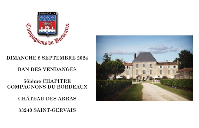 The Grand Maître, Mrs Chantal Dufaure, informs us that the wine brotherhood Les Compagnons de Bordeaux is holding its 56th Induction Ceremony and Banquet on Sunday 8th September 2024 le dimanche 8 septembre 2024.