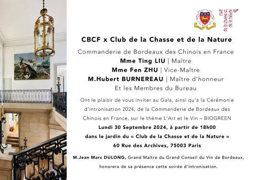 The Commanderie de Bordeaux of Chinese people living in France (CBCF) is pleased to announce a superb event to be held on 30th September 2024, at the Club de la Chasse et de la Nature in Paris, in the presence of the Grand Maître of the Grand Conseil du Vin de Bordeaux, Jean-Marc Dulong: an induction ceremony followed by a Gala Dinner, with the theme of “Art and Wine – ORGANIC or GREEN”.