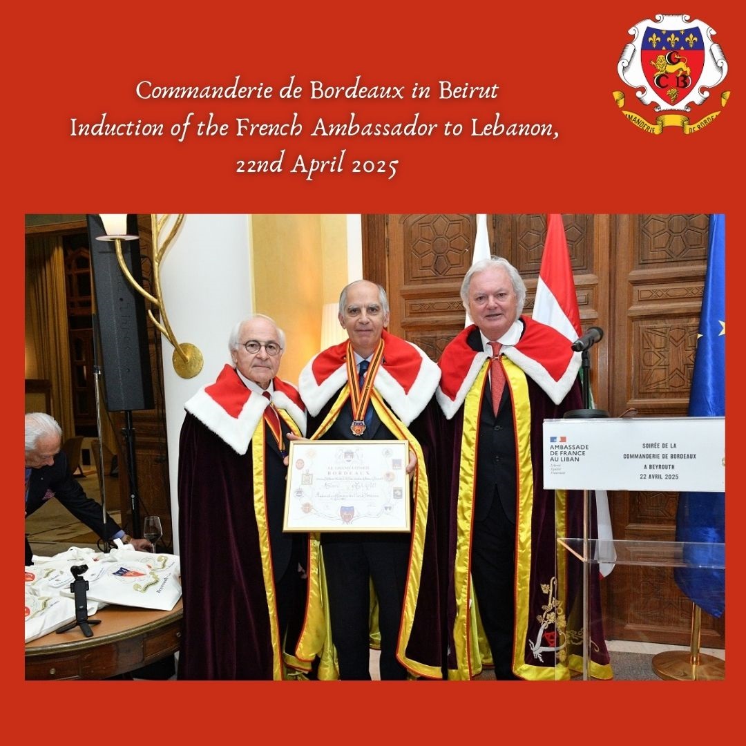 At the residence of the French Ambassador to Lebanon, La Résidence des Pins, on 22nd April 2025, Maître Etienne Debbané and his Commanderie de Bordeaux in Beirut hosted an induction ceremony, followed by a dinner.