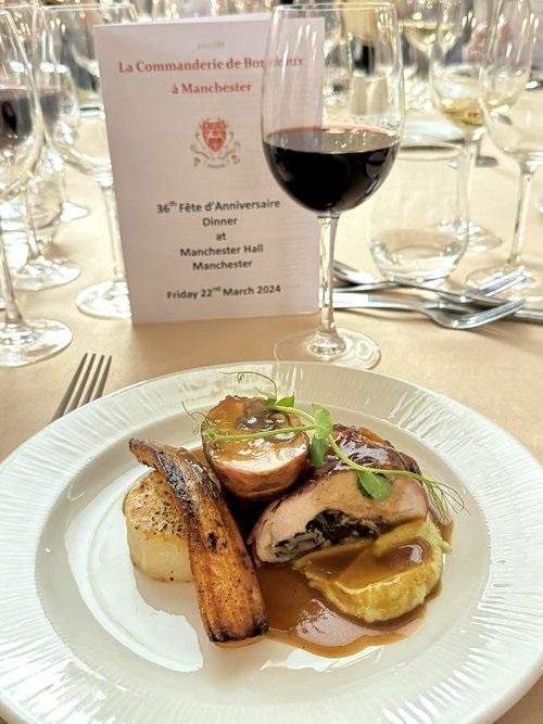 The Maître welcomed everyone and reminded us of past Fêtes of the Commanderie de Manchester – 36 years and still going strong! The meal started with a somewhat unusual choice of white onion soup but any doubts some members had were soon allayed as it was full of flavour yet light. The accompanying wine – “R” de Rieussec 2017 – worked beautifully with it, showing rich fruit and an excellent balance.